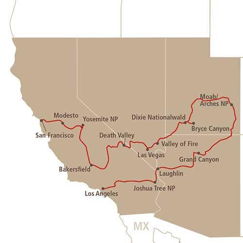 Keine andere Region der USA steht mehr für "Das Land der unbegrenzten Möglichkeiten" als die Westküste. Erleben Sie die atemberaubende Schönheit der Natur und die pulsierenden Metropolen im Westen der USA. Das größte Naturwunder der USA der Gran Canyon, der Inbegriff des Wilden Westens das Monument Valley, die unglaublichen Farbspiele im Bryce und Arches Nationalpark und einer der schönsten Nationalparks Kaliforniens der Yosemite Park machen die Faszination dieser Reise aus. Fesselnde Wunder der Natur soweit das Auge reicht.
