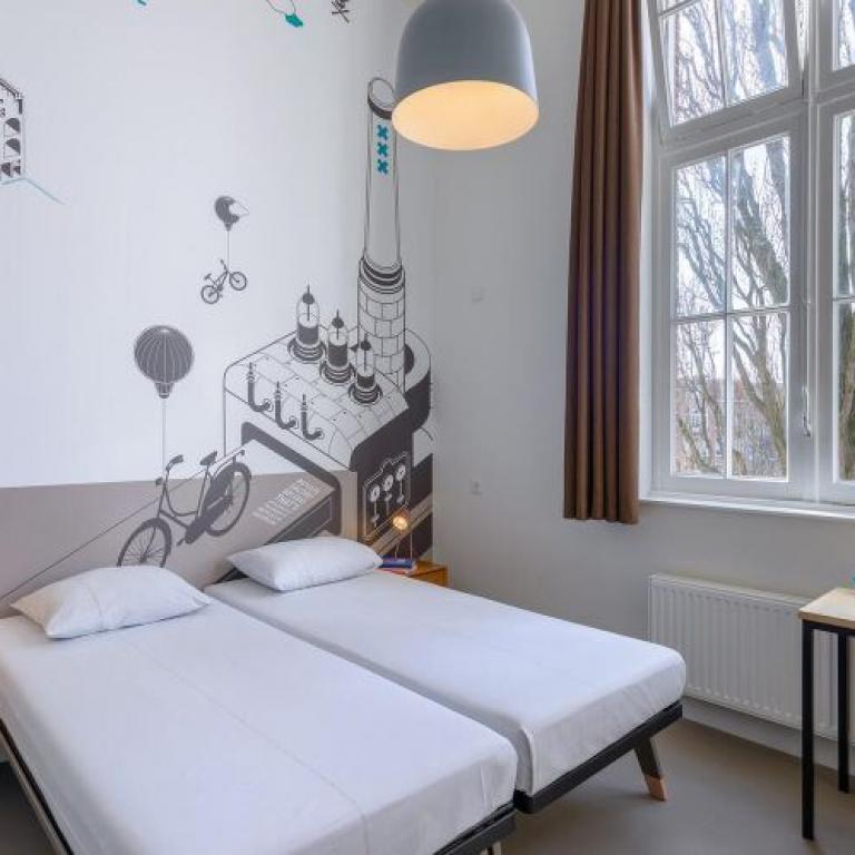 hat eine einzigartige Lage, mitten im berühmten Vondelpark, nur wenige Gehminuten vom Leidseplein, dem Museumplein und den verschiedenen bekannten Einkaufsstraßen entfernt; In diesem Hostel wohnen Sie im Herzen der Stadt! Die Unterbringung der Schüler*innen erfolgt in freundlich eingerichteten Mehrbettzimmern (für ca. 4 bis 8 Personen) mit Dusche/WC. Die Begleitpersonen sind in Einzel- bzw. Doppelzimmern untergebracht. Zur Ausstattung gehören eine Rezeption, Restaurant, Bar, Aufenthaltsraum, kostenfreies Wlan, Getränke und Snackautomaten.